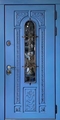 Синяя дверь окрас по RAL, с ажурным рисунком, стеклом и ковкой