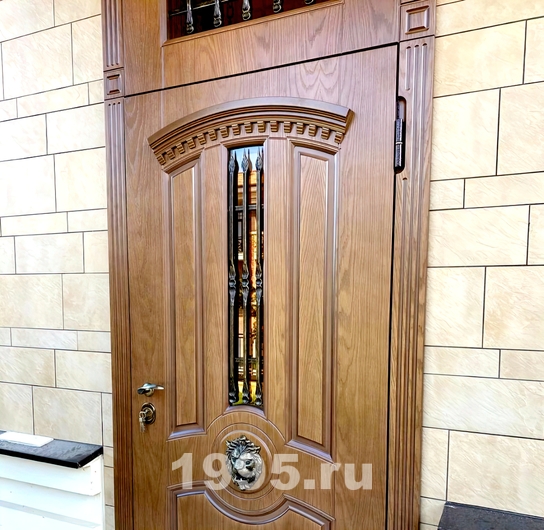 Дверь входная МДФ шпон с верхней вставкой, стеклопакетом и кованой решеткой №34